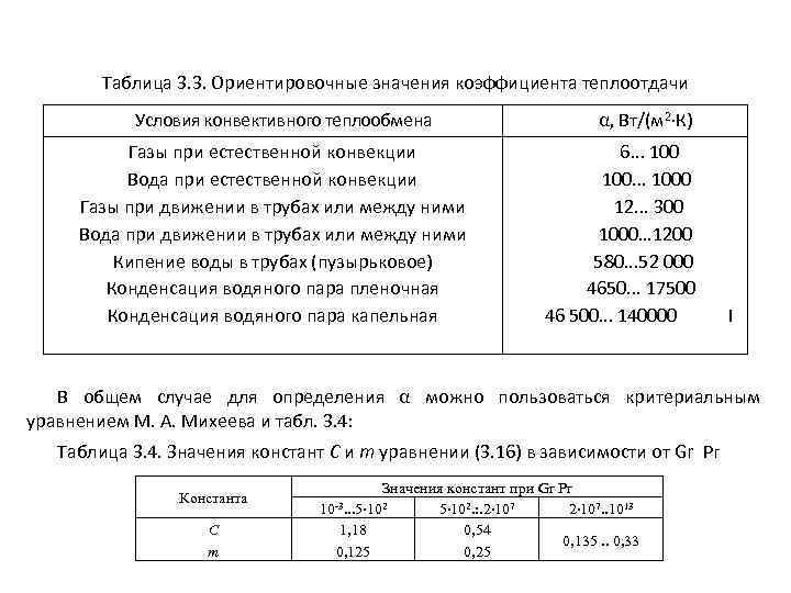 Таблица 3. 3. Ориентировочные значения коэффициента теплоотдачи Условия конвективного теплообмена Газы при естественной конвекции Вода при естественной конвекции Газы при движении в трубах или между ними Вода при движении в трубах или между ними Кипение воды в трубах (пузырьковое) Конденсация водяного пара пленочная Конденсация водяного пара капельная α, Вт/(м 2 К) 6. . . 1000 12. . . 300 1000. . . 1200 580. . . 52 000 4650. . . 17500 46 500. . . 140000 I В общем случае для определения α можно пользоваться критериальным уравнением М. А. Михеева и табл. 3. 4: Таблица 3. 4. Значения констант С и m уравнении (3. 16) в зависимости от Gr Рг Константа С т Значения констант при Gr Pr 5 102. : . 2 107. . 1013 1, 18 0, 54 0, 135. . 0, 33 0, 125 0, 25 10 -3. . . 5 102