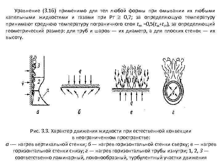 Уравнение (3. 16) применимо для тел любой формы при омывании их любыми капельными жидкостями и газами при Рr 0, 7; за определяющую температуру принимают среднюю температуру пограничного слоя tm =0, 5(tж+tст), за определяющий геометрический размер: для труб и шаров — их диаметр, а для плоских стенок — их высоту. Рис. 3. 3. Характер движения жидкости при естественной конвекции в неограниченном пространстве: а -— нагрев вертикальной стенки; б — нагрев горизонтальной стенки сверху; в — нагрев горизонтальной стенки снизу; г — нагрев горизонтальной трубы изнутри; 1, 2, 3 — соответственно ламинарный, локонообразный, турбулентный участки движения
