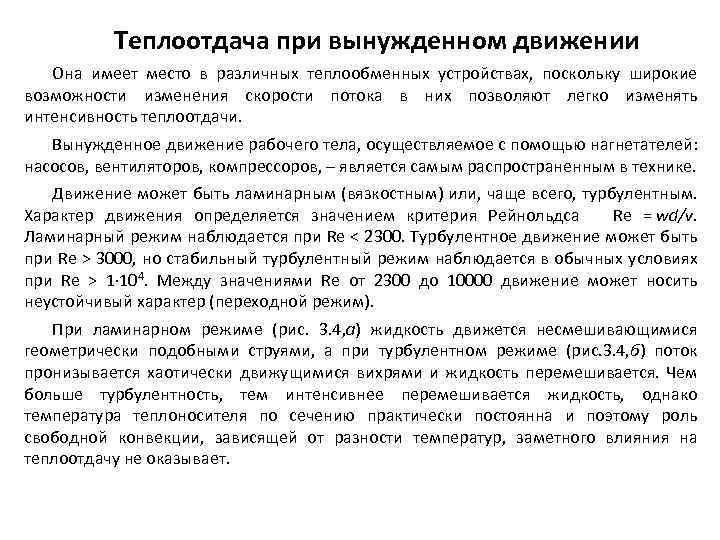 Теплоотдача при вынужденном движении Она имеет место в различных теплообменных устройствах, поскольку широкие возможности изменения скорости потока в них позволяют легко изменять интенсивность теплоотдачи. Вынужденное движение рабочего тела, осуществляемое с помощью нагнетателей: насосов, вентиляторов, компрессоров, – является самым распространенным в технике. Движение может быть ламинарным (вязкостным) или, чаще всего, турбулентным. Характер движения определяется значением критерия Рейнольдса Re = wd/v. Ламинарный режим наблюдается при Re < 2300. Турбулентное движение может быть при Re > 3000, но стабильный турбулентный режим наблюдается в обычных условиях при Re > 1 104. Между значениями Re от 2300 до 10000 движение может носить неустойчивый характер (переходной режим). При ламинарном режиме (рис. 3. 4, а) жидкость движется несмешивающимися геометрически подобными струями, а при турбулентном режиме (рис. 3. 4, б) поток пронизывается хаотически движущимися вихрями и жидкость перемешивается. Чем больше турбулентность, тем интенсивнее перемешивается жидкость, однако температура теплоносителя по сечению практически постоянна и поэтому роль свободной конвекции, зависящей от разности температур, заметного влияния на теплоотдачу не оказывает.