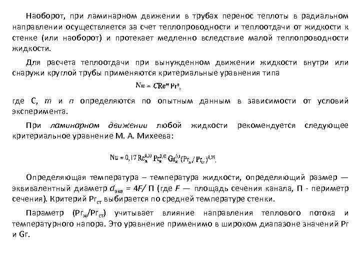 Наоборот, при ламинарном движении в трубах перенос теплоты в радиальном направлении осуществляется за счет теплопроводности и теплоотдачи от жидкости к стенке (или наоборот) и протекает медленно вследствие малой теплопроводности жидкости. Для расчета теплоотдачи при вынужденном движении жидкости внутри или снаружи круглой трубы применяются критериальные уравнения типа где С, т и п определяются по опытным данным в зависимости от условий эксперимента. При ламинарном движении любой жидкости рекомендуется следующее критериальное уравнение М. А. Михеева: Определяющая температура – температура жидкости, определяющий размер — эквивалентный диаметр dэкв = 4 F/ П (где F — площадь сечения канала, П - периметр сечения). Критерий Ргст выбирается по средней температуре стенки. Параметр (Рrж/Рrст) учитывает влияние направления теплового потока и температурного напора. Это уравнение применимо в широком диапазоне значений Рг и Gr.