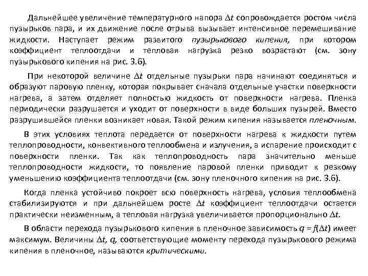 Дальнейшее увеличение температурного напора t сопровождается ростом числа пузырьков пара, и их движение после отрыва вызывает интенсивное перемешивание жидкости. Наступает режим развитого пузырькового кипения, при котором коэффициент теплоотдачи и тепловая нагрузка резко возрастают (см. зону пузырькового кипения на рис. 3. 6). При некоторой величине t отдельные пузырьки пара начинают соединяться и образуют паровую пленку, которая покрывает сначала отдельные участки поверхности нагрева, а затем отделяет полностью жидкость от поверхности нагрева. Пленка периодически разрушается и уходит от поверхности в виде больших пузырей. Вместо разрушившейся пленки возникает новая. Такой режим кипения называется пленочным. В этих условиях теплота передается от поверхности нагрева к жидкости путем теплопроводности, конвективного теплообмена и излучения, а испарение происходит с поверхности пленки. Так как теплопроводность пара значительно меньше теплопроводности жидкости, то появление паровой пленки приводит к резкому уменьшению коэффициента теплоотдачи (см. зону пленочного кипения на рис. 3. 6). Когда пленка устойчиво покроет всю поверхность нагрева, условия теплообмена стабилизируются и при дальнейшем росте t коэффициент теплоотдачи остается практически неизменным, а тепловая нагрузка увеличивается пропорционально t. В области перехода пузырькового кипения в пленочное зависимость q = f( t) имеет максимум. Величины t, q, соответствующие моменту перехода пузырькового режима кипения в пленочное, называются критическими.