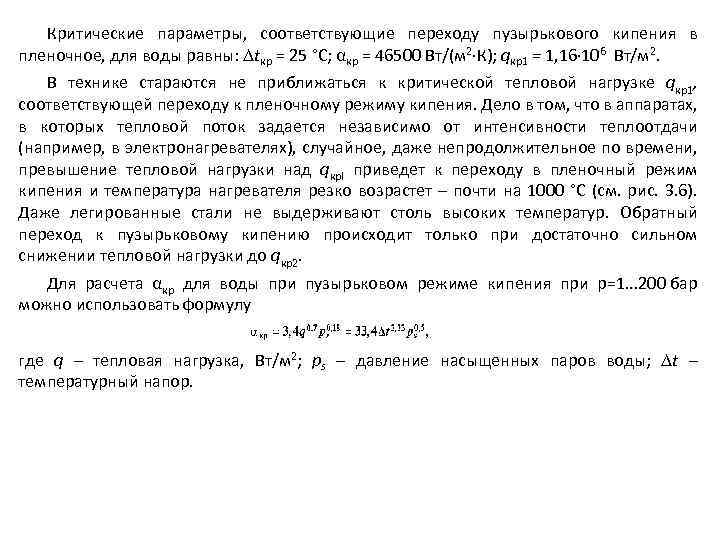Критические параметры, соответствующие переходу пузырькового кипения в пленочное, для воды равны: tкр = 25 °С; αкр = 46500 Вт/(м 2 К); qкр1 = 1, 16 106 Вт/м 2. В технике стараются не приближаться к критической тепловой нагрузке qкр1, соответствующей переходу к пленочному режиму кипения. Дело в том, что в аппаратах, в которых тепловой поток задается независимо от интенсивности теплоотдачи (например, в электронагревателях), случайное, даже непродолжительное по времени, превышение тепловой нагрузки над qкрl приведет к переходу в пленочный режим кипения и температура нагревателя резко возрастет – почти на 1000 °С (см. рис. 3. 6). Даже легированные стали не выдерживают столь высоких температур. Обратный переход к пузырьковому кипению происходит только при достаточно сильном снижении тепловой нагрузки до qкр2. Для расчета αкр для воды при пузырьковом режиме кипения при р=1. . . 200 бар можно использовать формулу где q – тепловая нагрузка, Вт/м 2; ps – давление насыщенных паров воды; t – температурный напор.