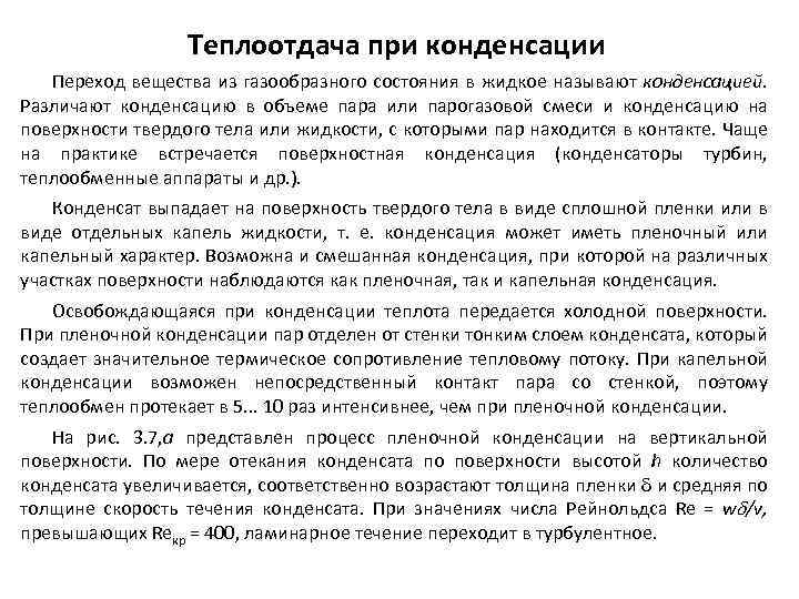 Теплоотдача при конденсации Переход вещества из газообразного состояния в жидкое называют конденсацией. Различают конденсацию в объеме пара или парогазовой смеси и конденсацию на поверхности твердого тела или жидкости, с которыми пар находится в контакте. Чаще на практике встречается поверхностная конденсация (конденсаторы турбин, теплообменные аппараты и др. ). Конденсат выпадает на поверхность твердого тела в виде сплошной пленки или в виде отдельных капель жидкости, т. е. конденсация может иметь пленочный или капельный характер. Возможна и смешанная конденсация, при которой на различных участках поверхности наблюдаются как пленочная, так и капельная конденсация. Освобождающаяся при конденсации теплота передается холодной поверхности. При пленочной конденсации пар отделен от стенки тонким слоем конденсата, который создает значительное термическое сопротивление тепловому потоку. При капельной конденсации возможен непосредственный контакт пара со стенкой, поэтому теплообмен протекает в 5. . . 10 раз интенсивнее, чем при пленочной конденсации. На рис. 3. 7, а представлен процесс пленочной конденсации на вертикальной поверхности. По мере отекания конденсата по поверхности высотой h количество конденсата увеличивается, соответственно возрастают толщина пленки и средняя по толщине скорость течения конденсата. При значениях числа Рейнольдса Re = w /v, превышающих Reкр = 400, ламинарное течение переходит в турбулентное.