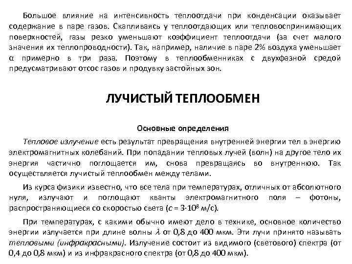Большое влияние на интенсивность теплоотдачи при конденсации оказывает содержание в паре газов. Скапливаясь у теплоотдающих или тепловоспринимающих поверхностей, газы резко уменьшают коэффициент теплоотдачи (за счет малого значения их теплопроводности). Так, например, наличие в паре 2% воздуха уменьшает α примерно в три раза. Поэтому в теплообменниках с двухфазной средой предусматривают отсос газов и продувку застойных зон. ЛУЧИСТЫЙ ТЕПЛООБМЕН Основные определения Тепловое излучение есть результат превращения внутренней энергии тел в энергию электромагнитных колебаний. При попадании тепловых лучей (волн) на другое тело их энергия частично поглощается им, снова превращаясь во внутреннюю. Так осуществляется лучистый теплообмен между телами. Из курса физики известно, что все тела при температурах, отличных от абсолютного нуля, излучают и поглощают кванты электромагнитного поля – фотоны, распространяющиеся со скоростью света (с = 3 108 м/с). При температурах, с какими обычно имеют дело в технике, основное количество энергии излучается при длине волны от 0, 8 до 400 мкм. Эти лучи принято называть тепловыми (инфракрасными). Излучение состоит из видимого (светового) спектра (от 0, 4 до 0, 8 мкм) и из инфракрасного спектра (от 0, 8 до 400 мкм).