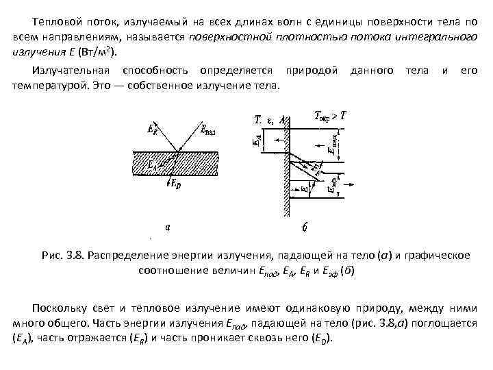 Тепловой поток, излучаемый на всех длинах волн с единицы поверхности тела по всем направлениям, называется поверхностной плотностью потока интегрального излучения Е (Вт/м 2). Излучательная способность определяется природой данного тела и его температурой. Это — собственное излучение тела. Рис. 3. 8. Распределение энергии излучения, падающей на тело (а) и графическое соотношение величин Епад, EA, ER и Еэф (б) Поскольку свет и тепловое излучение имеют одинаковую природу, между ними много общего. Часть энергии излучения Епад, падающей на тело (рис. 3. 8, а) поглощается (ЕА), часть отражается (ER) и часть проникает сквозь него (ED).