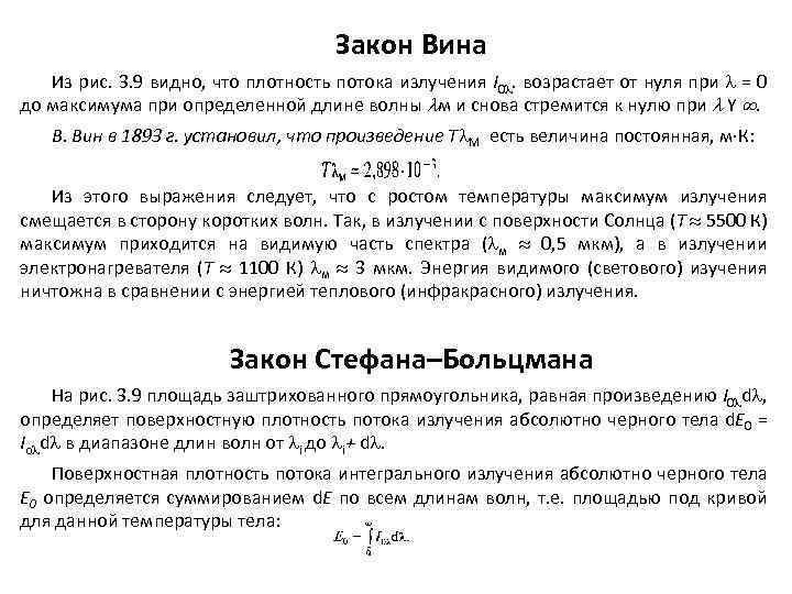 Закон Вина Из рис. 3. 9 видно, что плотность потока излучения I 0. возрастает от нуля при = 0 до максимума при определенной длине волны м и снова стремится к нулю при Y . В. Вин в 1893 г. установил, что произведение Т М есть величина постоянная, м К: Из этого выражения следует, что с ростом температуры максимум излучения смещается в сторону коротких волн. Так, в излучении с поверхности Солнца (T 5500 К) максимум приходится на видимую часть спектра ( м 0, 5 мкм), а в излучении электронагревателя (T 1100 К) м 3 мкм. Энергия видимого (светового) изучения ничтожна в сравнении с энергией теплового (инфракрасного) излучения. Закон Стефана–Больцмана На рис. 3. 9 площадь заштрихованного прямоугольника, равная произведению I 0 d , определяет поверхностную плотность потока излучения абсолютно черного тела d. E 0 = Io d в диапазоне длин волн от i до i+ d. Поверхностная плотность потока интегрального излучения абсолютно черного тела Е 0 определяется суммированием d. E по всем длинам волн, т. е. площадью под кривой для данной температуры тела: