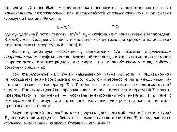 Конвективный теплообмен между потоком теплоносителя и поверхностью называют конвективной теплоотдачей, или теплоотдачей соприкосновением, и описывают формулой Ньютона–Рихмана: где qк– удельный поток теплоты, Вт/м 2; αк – коэффициент конвективной теплоотдачи, Вт/(м К); t – средняя . разность температур между греющей средой и нагреваемой поверхностью (температурный напор), К. Величину, обратную коэффициенту теплоотдачи, 1/α называют термическим сопротивлением. Коэффициент конвективной теплоотдачи зависит от многих факторов: скорости потока и характера движения, формы и размера обтекаемого тела, свойств и состояния среды и пр. При теплообмене излучением (называемом также лучистой и радиационной теплоотдачей) тела не соприкасаются друг с другом и перенос теплоты между ними при наличии: разности температур Т 1 > Т 2 осуществляется с помощью электромагнитной энергии. Происходит двойное превращение энергии – в теле с температурой Т 1 теплота превращается в излучение — носитель электромагнитной энергии, а в теле с температурой Т 2 в результате поглощения излучения электромагнитная энергия снова превращается в теплоту. Результирующий тепловой поток от излучающей среды с aбсолютной температурой Токр к поверхности, средняя абсолютная температура которой равна Тс, определяется по формуле, вытекающей из закона Стефана—Больцмана: