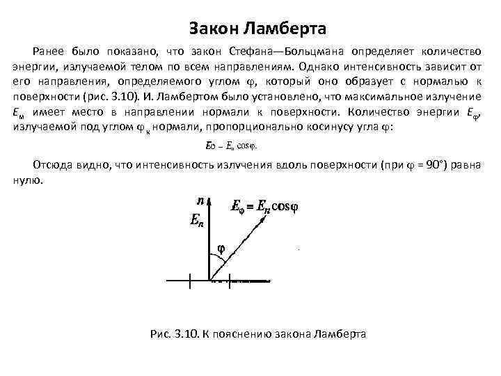 Закон Ламберта Ранее было показано, что закон Стефана—Больцмана определяет количество энергии, излучаемой телом по всем направлениям. Однако интенсивность зависит от его направления, определяемого углом , который оно образует с нормалью к поверхности (рис. 3. 10). И. Ламбертом было установлено, что максимальное излучение Ем имеет место в направлении нормали к поверхности. Количество энергии Е , излучаемой под углом к нормали, пропорционально косинусу угла : Отсюда видно, что интенсивность излучения вдоль поверхности (при = 90°) равна нулю. Рис. 3. 10. К пояснению закона Ламберта