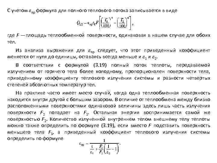 С учетом пр формула для полного теплового потока записывается в виде где F —площадь теплообменной поверхности, одинаковая в нашем случае для обоих тел. Из анализа выражения для пр следует, что этот приведенный коэффициент меняется от нуля до единицы, оставаясь всегда меньше и 1 и 2. В соответствии с формулой (3. 19) полный поток теплоты, передаваемой излучением от горячего тела более холодному, пропорционален поверхности тела, приведенному коэффициенту теплового излучения системы и разности четвертых степеней абсолютных температур тел. На практике часто имеет место случай, когда одна теплообменная поверхность находится внутри другой с большим зазором. В отличие от теплообмена между близко расположенными поверхностями одинаковой величины здесь лишь часть излучения поверхности F 2 попадает на F 1. Остальная энергия воспринимается самой же поверхностью F 2. Количество излученной внутреннем телом внешнему телу теплоты можно также определить по формуле (3. 19), если вместо F подставить поверхность меньшего тела F 1, а приведенный коэффициент теплового излучения системы определить по формуле
