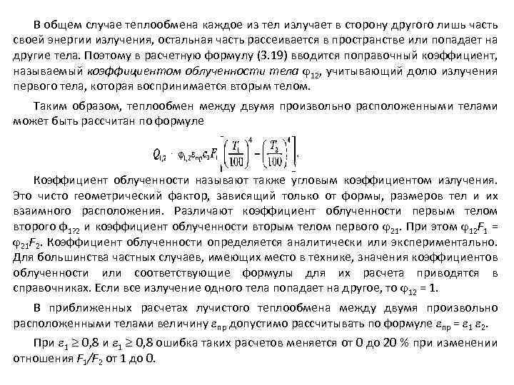 В общем случае теплообмена каждое из тел излучает в сторону другого лишь часть своей энергии излучения, остальная часть рассеивается в пространстве или попадает на другие тела. Поэтому в расчетную формулу (3. 19) вводится поправочный коэффициент, называемый коэффициентом облученности тела 12, учитывающий долю излучения первого тела, которая воспринимается вторым телом. Таким образом, теплообмен между двумя произвольно расположенными телами может быть рассчитан по формуле Коэффициент облученности называют также угловым коэффициентом излучения. Это чисто геометрический фактор, зависящий только от формы, размеров тел и их взаимного расположения. Различают коэффициент облученности первым телом второго ф1? 2 и коэффициент облученности вторым телом первого 21. При этом 12 F 1 = 21 F 2. Коэффициент облученности определяется аналитически или экспериментально. Для большинства частных случаев, имеющих место в технике, значения коэффициентов облученности или соответствующие формулы для их расчета приводятся в справочниках. Если все излучение одного тела попадает на другое, то 12 = 1. В приближенных расчетах лучистого теплообмена между двумя произвольно расположенными телами величину пр допустимо рассчитывать по формуле пр = 1 2. При 1 0, 8 ошибка таких расчетов меняется от 0 до 20 % при изменении отношения F 1/F 2 от 1 до 0.