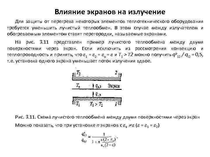 Влияние экранов на излучение Для защиты от перегрева некоторых элементов теплотехнического оборудования требуется уменьшить лучистый теплообмен. В этом случае между излучателем и обогреваемым элементом ставят перегородки, называемые экранами. На рис. 3. 11 представлен пример лучистого теплообмена между двумя поверхностями через экран. Если исключить из рассмотрения конвекцию и теплопроводность и принять, что 1 = 2 = э = и Т 1 > Т 2 можно получить qэ12 / ql 2 = 0, 5, т. е. установка одного экрана уменьшает поток излучения вдвое. Рис. 3. 11. Схема лучистого теплообмена между двумя поверхностями через экран Можно показать, что при установке п экранов с э ( = 1 = 2)