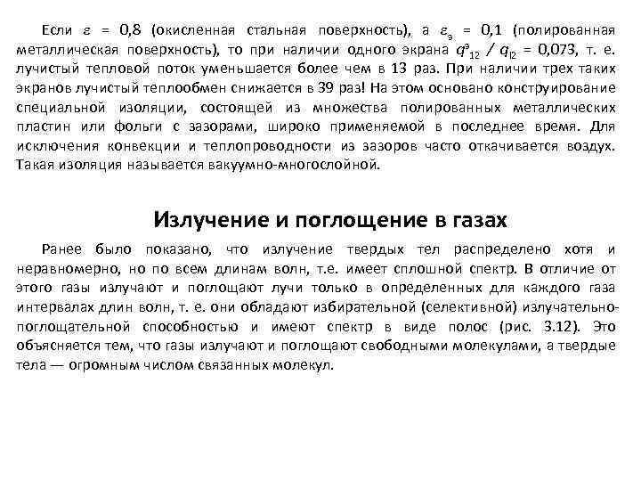 Если = 0, 8 (окисленная стальная поверхность), а э = 0, 1 (полированная металлическая поверхность), то при наличии одного экрана qэ12 / ql 2 = 0, 073, т. е. лучистый тепловой поток уменьшается более чем в 13 раз. При наличии трех таких экранов лучистый теплообмен снижается в 39 раз! На этом основано конструирование специальной изоляции, состоящей из множества полированных металлических пластин или фольги с зазорами, широко применяемой в последнее время. Для исключения конвекции и теплопроводности из зазоров часто откачивается воздух. Такая изоляция называется вакуумно-многослойной. Излучение и поглощение в газах Ранее было показано, что излучение твердых тел распределено хотя и неравномерно, но по всем длинам волн, т. е. имеет сплошной спектр. В отличие от этого газы излучают и поглощают лучи только в определенных для каждого газа интервалах длин волн, т. е. они обладают избирательной (селективной) излучательнопоглощательной способностью и имеют спектр в виде полос (рис. 3. 12). Это объясняется тем, что газы излучают и поглощают свободными молекулами, а твердые тела — огромным числом связанных молекул.