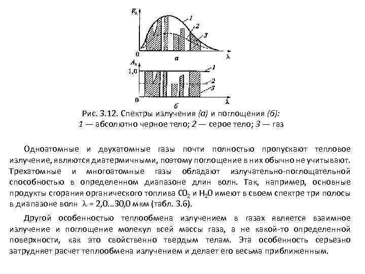 Рис. 3. 12. Спектры излучения (а) и поглощения (б): 1 — абсолютно черное тело; 2 — серое тело; 3 — газ Одноатомные и двухатомные газы почти полностью пропускают тепловое излучение, являются диатермичными, поэтому поглощение в них обычно не учитывают. Трехатомные и многоатомные газы обладают излучательно-поглощательной способностью в определенном диапазоне длин волн. Так, например, основные продукты сгорания органического топлива С 02 и Н 20 имеют в своем спектре три полосы в диапазоне волн = 2, 0. . . 30, 0 мкм (табл. 3. 6). Другой особенностью теплообмена излучением в газах является взаимное излучение и поглощение молекул всей массы газа, а не какой-то определенной поверхности, как это свойственно твердым телам. Эта особенность серьезно затрудняет расчет теплообмена излучением и делает его весьма приближенным.