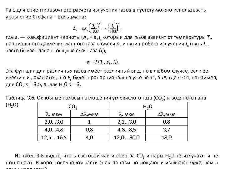 Так, для ориентировочного расчета излучения газов в пустоту можно использовать уравнение Стефана—Больцмана: где r — коэффициент черноты (А r = r), который для газов зависит от температуры Тr, парциального давления данного газа в смеси pir и пути пробега излучения Iп (путь Iп п часто бывает равен толщине слоя газа r), Эта функция для различных газов имеет различный вид, но в любом случае, если ее ввести в Еr, окажется, что Еr будет пропорциональна уже не T 4, а Тn, где п < 4; например, для СO 2 п = 3, 5, а. для Н 20 п = 3. Таблица 3. 6. Основные полосы поглощения углекислого газа (СO 2) и водяного пара (Н 2 O) СO НO , мкм 2, 0. . . 3, 0 4, 0. . . 4, 8 12, 5. . . 16, 5 2 , мкм 1 0, 8 4, 0 , мкм 2, 2. . . 3, 0 4, 8. . . 8, 5 12, 0. . . 30, 0 2 , мкм 0, 8 3, 7 18, 0 Из табл. 3. 6 видно, что в световой части спектра С 02 и пары Н 20 не излучают и не поглощают. В коротковолновой части спектра газы поглощают и излучают хуже, чем в