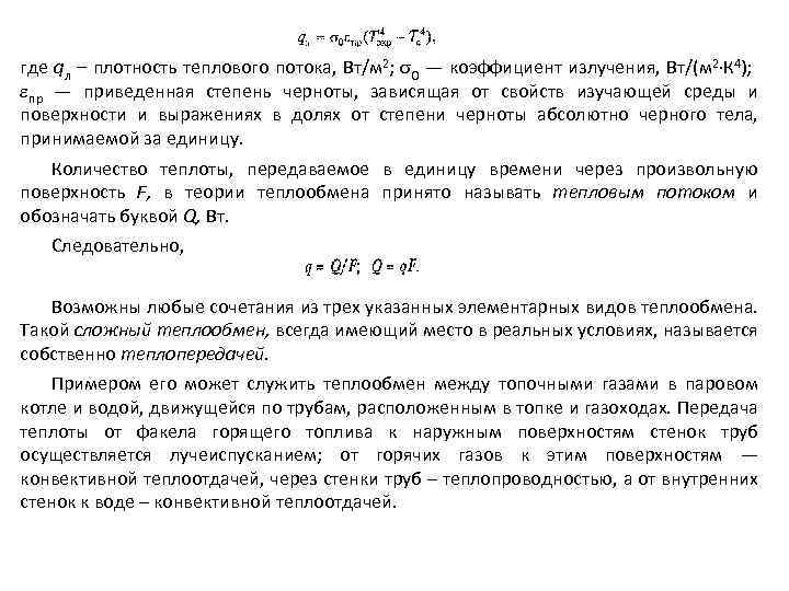 где qл – плотность теплового потока, Вт/м 2; 0 — коэффициент излучения, Вт/(м 2 К 4); пр — приведенная степень черноты, зависящая от свойств изучающей среды и поверхности и выражениях в долях от степени черноты абсолютно черного тела, принимаемой за единицу. Количество теплоты, передаваемое в единицу времени через произвольную поверхность F, в теории теплообмена принято называть тепловым потоком и обозначать буквой Q, Вт. Следовательно, Возможны любые сочетания из трех указанных элементарных видов теплообмена. Такой сложный теплообмен, всегда имеющий место в реальных условиях, называется собственно теплопередачей. Примером его может служить теплообмен между топочными газами в паровом котле и водой, движущейся по трубам, расположенным в топке и газоходах. Передача теплоты от факела горящего топлива к наружным поверхностям стенок труб осуществляется лучеиспусканием; от горячих газов к этим поверхностям — конвективной теплоотдачей, через стенки труб – теплопроводностью, а от внутренних стенок к воде – конвективной теплоотдачей.