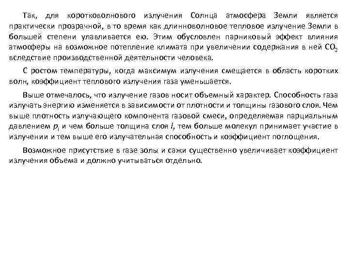 Так, для коротковолнового излучения Солнца атмосфера Земли является практически прозрачной, в то время как длинноволновое тепловое излучение Земли в большей степени улавливается ею. Этим обусловлен парниковый эффект влияния атмосферы на возможное потепление климата при увеличении содержания в ней СO 2 вследствие производственной деятельности человека. С ростом температуры, когда максимум излучения смещается в область коротких волн, коэффициент теплового излучения газа уменьшается. Выше отмечалось, что излучение газов носит объемный характер. Способность газа излучать энергию изменяется в зависимости от плотности и толщины газового слоя. Чем выше плотность излучающего компонента газовой смеси, определяемая парциальным давлением рi и чем больше толщина слоя l, тем больше молекул принимает участие в излучении и тем выше его излучательная способность и коэффициент поглощения. Возможное присутствие в газе золы и сажи существенно увеличивает коэффициент излучения объема и должно учитываться отдельно.