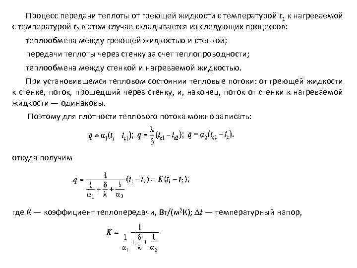 Процесс передачи теплоты от греющей жидкости с температурой t 1 к нагреваемой с температурой t 2 в этом случае складывается из следующих процессов: теплообмена между греющей жидкостью и стенкой; передачи теплоты через стенку за счет теплопроводности; теплообмена между стенкой и нагреваемой жидкостью. При установившемся тепловом состоянии тепловые потоки: от греющей жидкости к стенке, поток, прошедший через стенку, и, наконец, поток от стенки к нагреваемой жидкости — одинаковы. Поэтому для плотности теплового потока можно записать: откуда получим где К — коэффициент теплопередачи, Вт/(м 2 К); t — температурный напор,