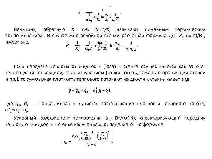 Величину, обратную Kl т. е. Rl=1/Kl называют линейным термическим сопротивлением. В случае многослойной стенки расчетная формула для Rl, (м К)/Вт, имеет вид Если передача теплоты от жидкости (газа) к стенке осуществляется как за счет теплоотдачи конвекцией, так и излучением (топки котлов, камеры сгорания двигателей и пр. ), то суммарная плотность теплового потока от жидкости к стенке имеет вид где qк, qл — конвективная и лучистая составляющие плотности теплового потока; α*1=α 1+ αи. Условный коэффициент теплоотдачи αи, Вт/(м 2 К), характеризующий передачу теплоты от жидкости к стенке излучением, определяется по формуле