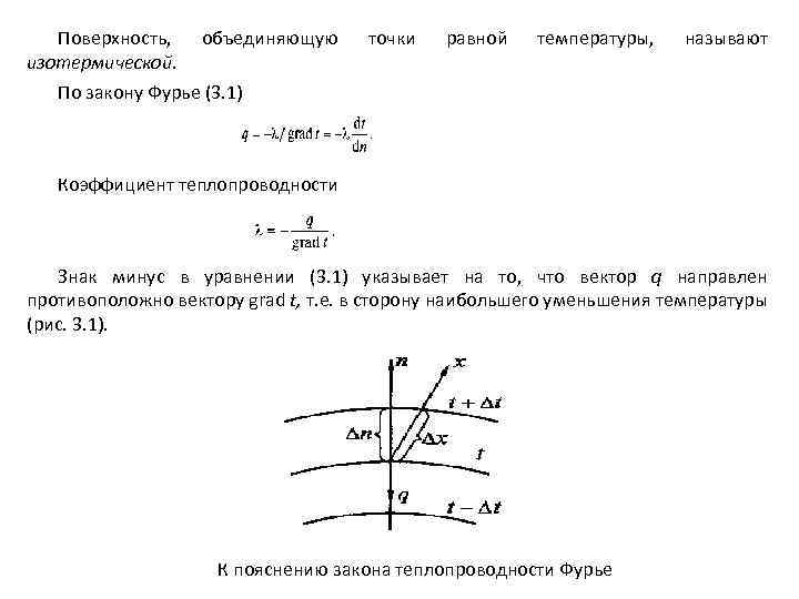 Поверхность, объединяющую изотермической. точки равной температуры, называют По закону Фурье (3. 1) Коэффициент теплопроводности Знак минус в уравнении (3. 1) указывает на то, что вектор q направлен противоположно вектору grad t, т. е. в сторону наибольшего уменьшения температуры (рис. 3. 1). К пояснению закона теплопроводности Фурье