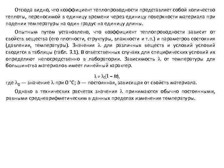 Отсюда видно, что коэффициент теплопроводности представляет собой количество теплоты, переносимой в единицу времени через единицу поверхности материала при падении температуры на один градус на единицу длины. Опытным путем установлено, что коэффициент теплопроводности зависит от свойств вещества (его плотности, структуры, влажности и т. п. ) и параметров состояния (давления, температуры). Значения для различных веществ и условий сводятся в таблицы (табл. 3. 1). В ответственных случаях для специфических условий их определяют непосредственно в лаборатории. Зависимость от температуры для большинства материалов имеет линейный характер. где 0 — значение при 0 °С; b — постоянная, зависящая от свойств материала. Однако в технических расчетах значения принимаются обычно постоянными, равными среднеарифметическим в данных пределах изменения температуры.