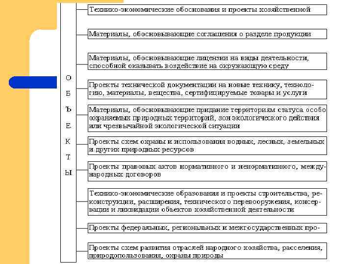 Экологическая экспертиза Результатом проведения экспертизы является заключение государственной экологической экспертизы - документ, содержащий обоснованные выводы о допустимости воздействия на окружающую природную среду хозяйственной и иной деятельности и о возможностях реализации объекта экспертизы. l При наличии положительного заключения открывается финансирование реализации объекта.