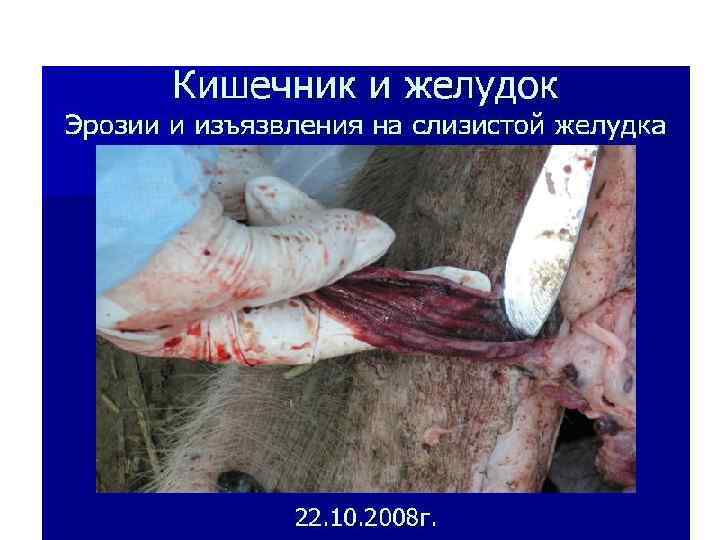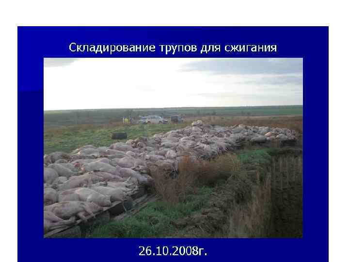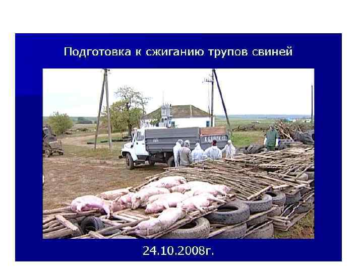 • АЧС- заразная вирусная болезнь • Сп-б заражения: контактный, алиментарный • Вирусоносители: грызуны, членистоногие, переболевшие свиньи (до 15 мес. ) • ИП- 5 -10 дней • Клиника: сверхострая, острая- парезы задних ног, синюшные пятна, поражение жкт, воспаление и некрозы во внутренних органах. • Редко-хроническое течение: артрит, пневмония, перикардит. • Диагноз: реакция диффузной преципитации • Лечение-нет. Бескровный забой и сжигание трупов. В 10 -км зоне всё свинопоголовье забивают, мясо- на консервы. • Карантин сним. ч-з 6 мес. с момента убоя, а разведение разрешается только ч-з год.