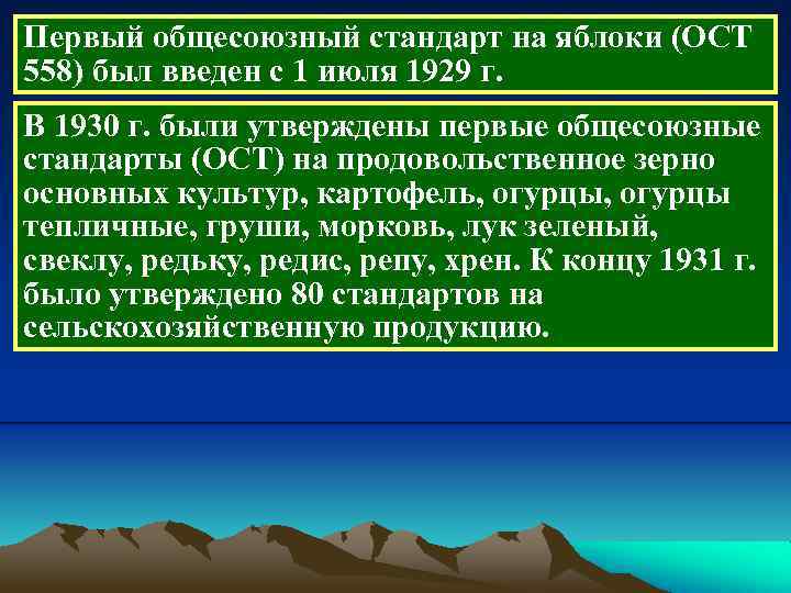 Первый общесоюзный стандарт на яблоки (ОСТ 558) был введен с 1 июля 1929 г. В 1930 г. были утверждены первые общесоюзные стандарты (ОСТ) на продовольственное зерно основных культур, картофель, огурцы тепличные, груши, морковь, лук зеленый, свеклу, редьку, редис, репу, хрен. К концу 1931 г. было утверждено 80 стандартов на сельскохозяйственную продукцию.