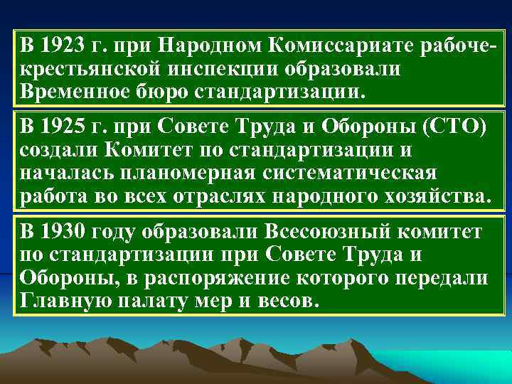 В 1923 г. при Народном Комиссариате рабоче крестьянской инспекции образовали Временное бюро стандартизации. В 1925 г. при Совете Труда и Обороны (СТО) создали Комитет по стандартизации и началась планомерная систематическая работа во всех отраслях народного хозяйства. В 1930 году образовали Всесоюзный комитет по стандартизации при Совете Труда и Обороны, в распоряжение которого передали Главную палату мер и весов.