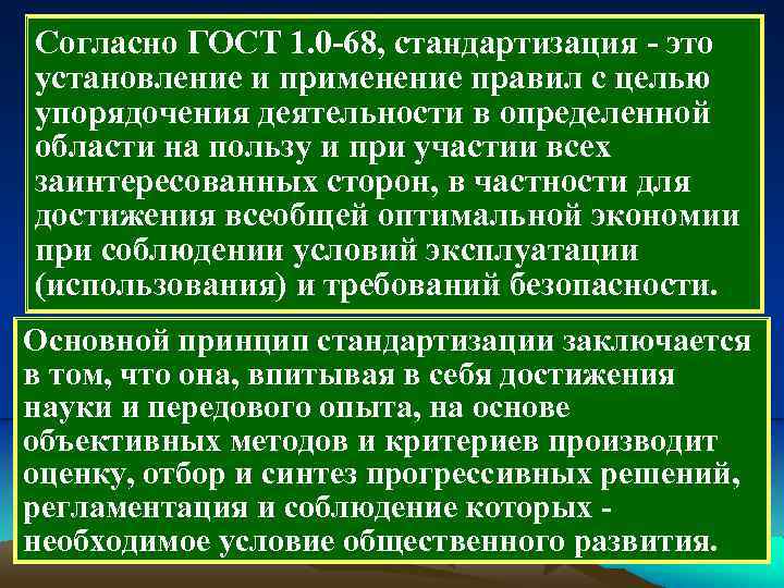 Согласно ГОСТ 1. 0 68, стандартизация это установление и применение правил с целью упорядочения деятельности в определенной области на пользу и при участии всех заинтересованных сторон, в частности для достижения всеобщей оптимальной экономии при соблюдении условий эксплуатации (использования) и требований безопасности. Основной принцип стандартизации заключается в том, что она, впитывая в себя достижения науки и передового опыта, на основе объективных методов и критериев производит оценку, отбор и синтез прогрессивных решений, регламентация и соблюдение которых необходимое условие общественного развития.