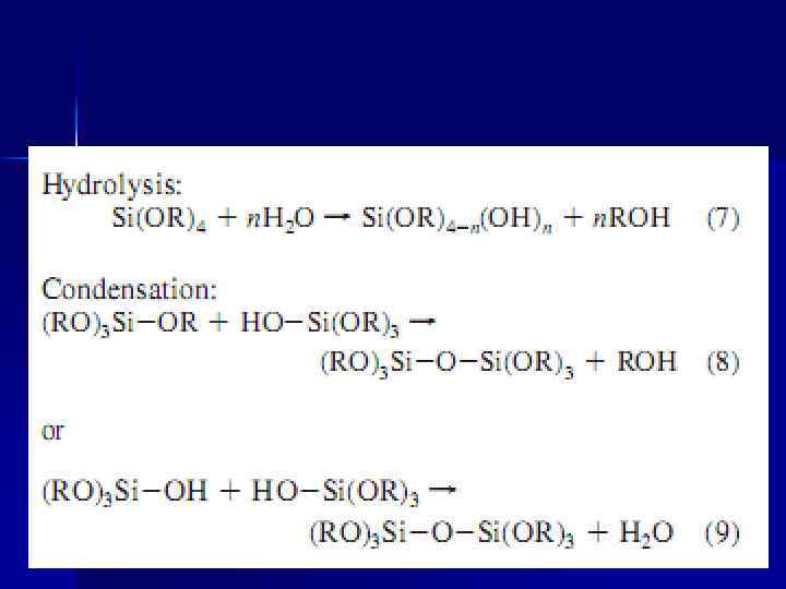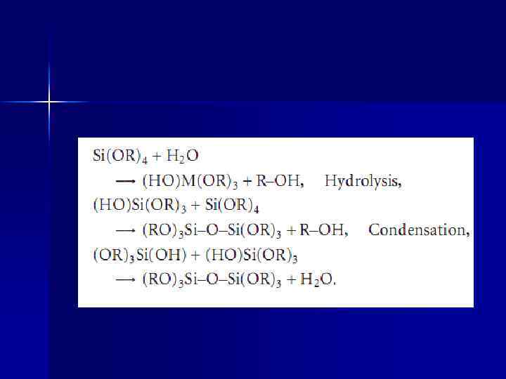 Процесс гелеобразования обеспечивается изменениями как на молекулярном, так и на структурном уровне. На молекулярном уровне образование геля из растворов, содержащих алкоксиды металлов, сопровождается реакциями гидролиза и поликонденсации: n М-ОR- + HOH M-OH + R(OH), (1. 1) n M-OH + RO-M M-O-M + R(OH) , (1. 2) где R – алкил (углеводородный радикал CH 3, C 2 H 5 и т. д, n M – катион пленкообразователя, например Si, Zr, Ti. Для силикагелей, например, реакция конденсации может также протекать с выделением воды: n Si-OH + HO-Si Si-O-Si + H 2 O (1. 3) n