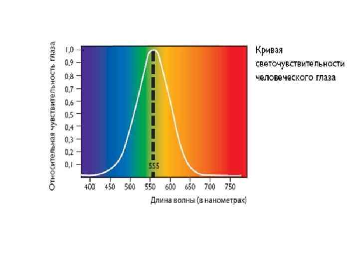• Цветовая чувствительность. Видимая человеческим глазом часть спектра электромагнитных колебаний – составляет примерно от 350 до 800 нм. При этом различные частоты (цвета) воспринимаются системой зрения поразному, что определяется спектральной чувствительностью человеческого зрения.