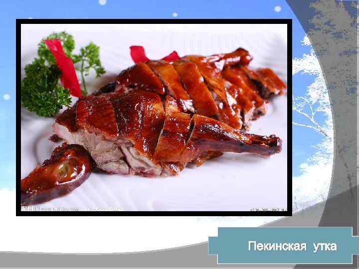 Утка по—пекинс ки, блины , слад кая бобовая паста, л ук