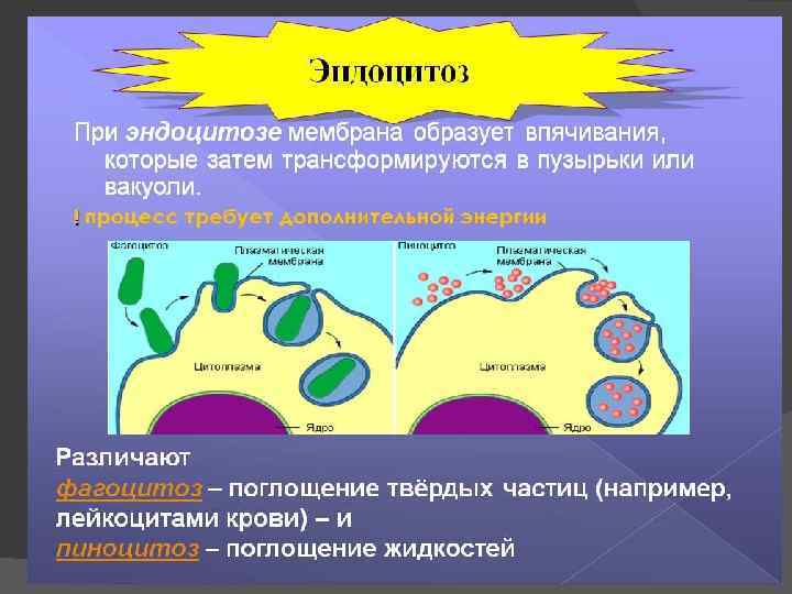 Пиноцитоз (от греч. pino — пью). Крупные молекулы или агрегаты молекул соприкасаются с наружной поверхностью мембраны и окружаются ею с образованием пузырька (вакуоли), который отделяется от мембраны и погружается внутрь клетки. Далее содержимое пузырька может высвобождаться внутри клетки или с другой стороны клетки наружу путем экзоцитоза.