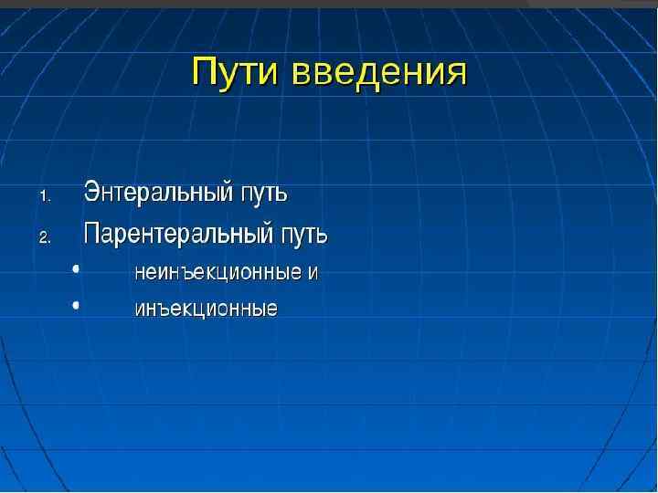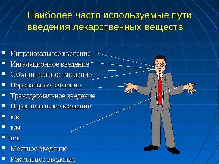 ПУТИ ВВЕДЕНИя ЛС В ОРГАНИЗМ Для системного действия существуют способы введения: Энтеральный: Парентеральный: - оральный - в/в, п/к, в/м, в/а - сублингвальный - ингаляционный - ректальный - субарахноидальный - через зонд - трансдермальный - внутрикостный