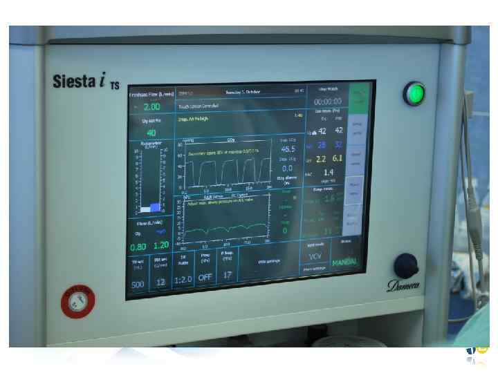 Мониторинг • Дыхательный (Pin; Кривая поток/объем; Sp. O 2; ex. CO 2 • Кардиомониторинг: ЧСС, ЭКГ, н. АД, диурез • Температурный мониторинг • Мониторинг глубины анестезии (BIS, ЭЭГ, CSI, Narcotrend) • Мониторинг нейромышечной проводимости