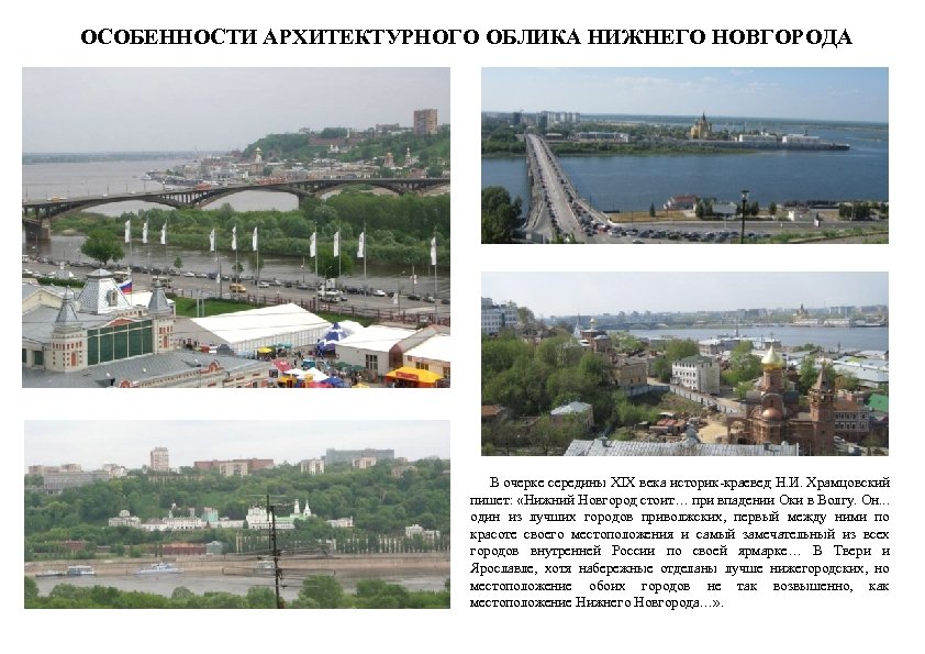 ОСОБЕННОСТИ АРХИТЕКТУРНОГО ОБЛИКА НИЖНЕГО НОВГОРОДА В очерке середины XIX века историк-краевед Н. И. Храмцовский пишет: «Нижний Новгород стоит… при впадении Оки в Волгу. Он. . . один из лучших городов приволжских, первый между ними по красоте своего местоположения и самый замечательный из всех городов внутренней России по своей ярмарке… В Твери и Ярославле, хотя набережные отделаны лучше нижегородских, но местоположение обоих городов не так возвышенно, как местоположение Нижнего Новгорода…» .
