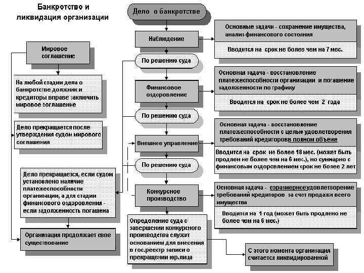 В законе определяются следующие процедуры банкротства (ст. 27): • наблюдение применяется к должнику в целях обеспечения сохранности имущества должника, проведения анализа финансового состояния должника, составления реестра требований кредиторов и проведения первого собрания кредиторов; • финансовое оздоровление применяется к должнику в целях восстановления его платежеспособности и погашения задолженности в соответствии с графиком погашения задолженности; • внешнее управление применяется к должнику с целью восстановления его платежеспособности; • конкурсное производство применяется к должнику, признан ному банкротом, с целью соразмеренного удовлетворения требований кредиторов; • мировое соглашение представляет собой процедуру банкротства, которая может быть применена на любой стадии рассмотрения дела о банкротстве в целях прекращения производства по делу о банкротстве путем достижения соглашения между должником и кредиторами.