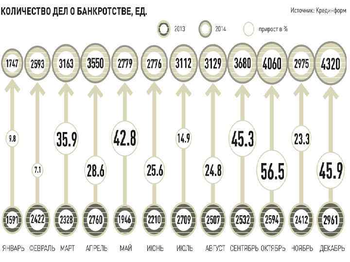 Сведения о рассмотрении арбитражными судами Российской Федерации дел о несостоятельности (банкротстве) в 2010 2013 г. г. 2013 г. 2010 г. Поступило заявлений о признании должников банкротами из них: принято к производству 2011 г 2012 г. 40 243 33 385 40 864 31 921 33 270 27 422 33 226 27 351 94 92 67 7 3 4 986 922 803 13 25 15 12 794 14 072 13 144 Количество дел, по которым проводилась процедура финансового оздоровления 91 из них: прекращено производство в связи с погашением 6 задолженности Количество дел, по которым проводилась процедура внешнего управления 908 из них: прекращено производство в связи с погашением 14 задолженности Принято решений о признании должников банкротами и открытии процедуры 16 009