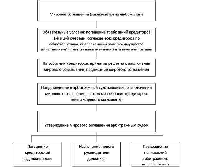 • Со стороны должника решение о заключении мирового соглашения принимается руководителем организации-должника, а при внешнем управлении и конкурсном производстве соответственно внешним или конкурсным управляющим. Мировое соглашение утверждается арбитражным судом только после погашения задолженности по требованиям кредиторов первой и второй очереди. При заключении мирового соглашения дело о банкротстве прекращается.