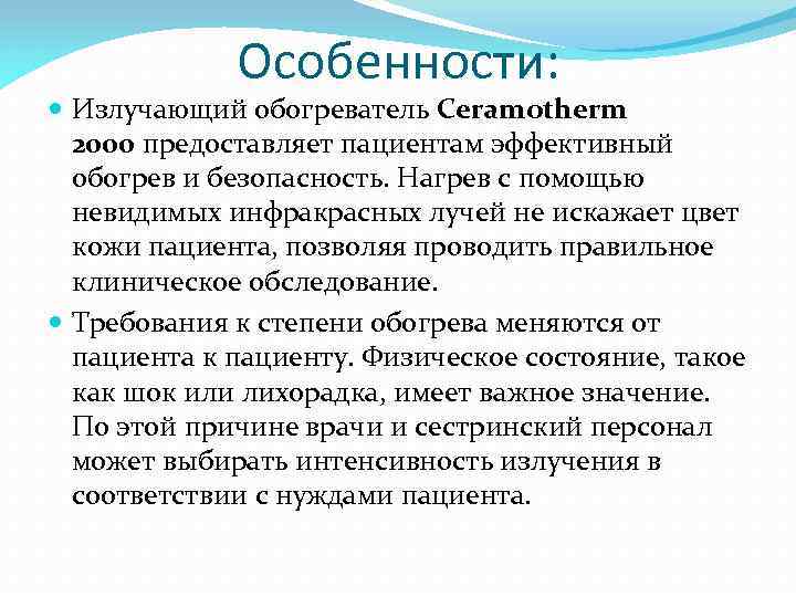 Особенности: Излучающий обогреватель Ceramotherm 2000 предоставляет пациентам эффективный обогрев и безопасность. Нагрев с помощью невидимых инфракрасных лучей не искажает цвет кожи пациента, позволяя проводить правильное клиническое обследование. Требования к степени обогрева меняются от пациента к пациенту. Физическое состояние, такое как шок или лихорадка, имеет важное значение. По этой причине врачи и сестринский персонал может выбирать интенсивность излучения в соответствии с нуждами пациента.
