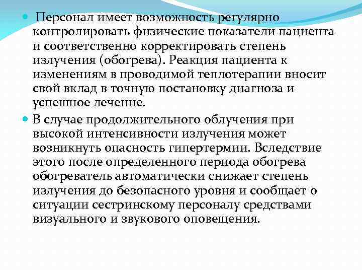 Персонал имеет возможность регулярно контролировать физические показатели пациента и соответственно корректировать степень излучения (обогрева). Реакция пациента к изменениям в проводимой теплотерапии вносит свой вклад в точную постановку диагноза и успешное лечение. В случае продолжительного облучения при высокой интенсивности излучения может возникнуть опасность гипертермии. Вследствие этого после определенного периода обогреватель автоматически снижает степень излучения до безопасного уровня и сообщает о ситуации сестринскому персоналу средствами визуального и звукового оповещения.