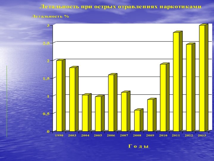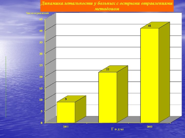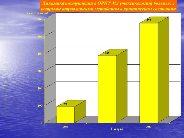 Тенденции последнего времени ØРезкое увеличение количества больных с острыми отравлениями метадоном (соотношение героин/метадон – 3/1 в 2011 году, 1/3 в 2012 году, 1/5 в 2013 году).