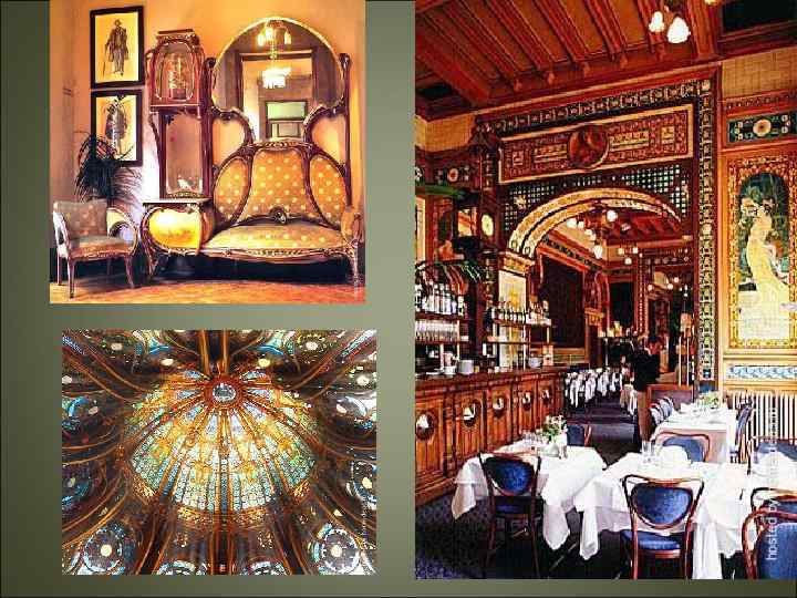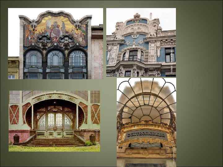 Особенности архитектуры модерна -Новое понимание архитектуры как создание "среды обитания", которая активно преобразует самого человека. - Органичность как принцип формообразования архитектурной системы - единство полезного и прекрасного. - Метод проектирования «изнутри наружу» и «выплескивание интерьера на фасады здания» . - Отказ от ордерной системы. Ассиметричность при формировании планов и композиции зданий и расположении оконных и дверных проемов. - Разнообразие функционально целесообразных элементов - эркеров, балконов, башенок, оконных проемов. - Фасады округлых, иногда фантастически выгнутых контуров , использование решеток из кованого металла, витражей, глазурованной керамики.
