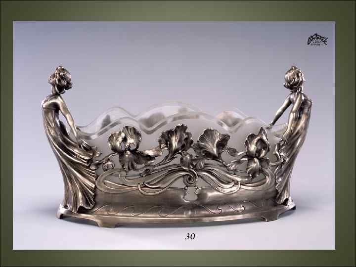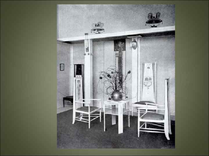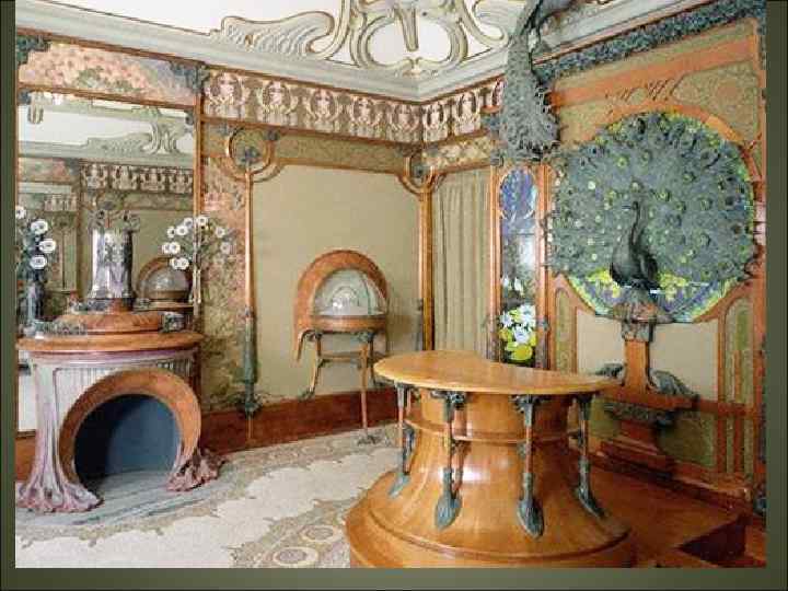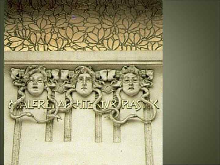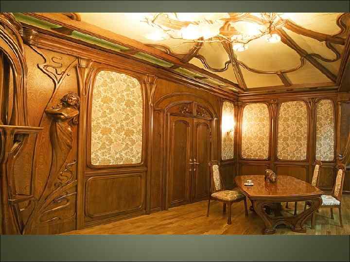 Модерн • Большое внимание уделялось не только внешнему виду зданий, но и интерьеру, который тщательно прорабатывался. Все конструктивные элементы: лестницы, двери, столбы, балконы — художественно обрабатывались. • Часто художники модерна брали за основу своих рисунков орнаменты из растительного мира. «Визитной карточкой» этого стиля стала вышивка Германа Обриста «Удар бича» .