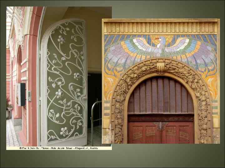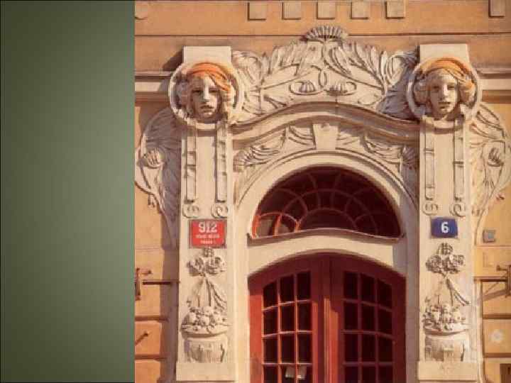 • Стиль модерн: эстетика красоты Цель модернасоздание нового универсального синтетического стиля. В одном произведении соединялись в причудливом организме архитектура, пластика, живопись, декоративноприкладное искусство, что способствовало эстетизации быта. Освальд Поливка Вход в дом Новака Прага. Чехия