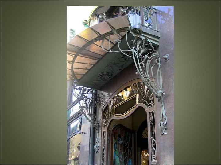 Модерн • Стиль «Модерн" развивается главным образом в архитектуре городских особняков и дорогих многоквартирных зданий, загородных вилл, банков, отелей. Э. Отан Деталь фасада на Рю де Абевилль Париж