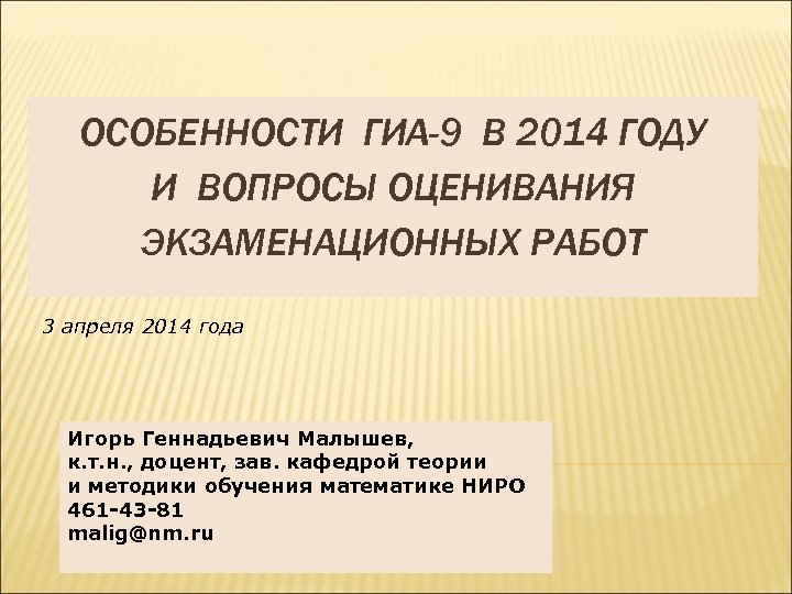 ОСОБЕННОСТИ ГИА-9 В 2014 ГОДУ И ВОПРОСЫ ОЦЕНИВАНИЯ ЭКЗАМЕНАЦИОННЫХ РАБОТ 3 апреля 2014 года Игорь Геннадьевич Малышев, к. т. н. , доцент, зав. кафедрой теории и методики обучения математике НИРО 461 -43 -81 malig@nm. ru