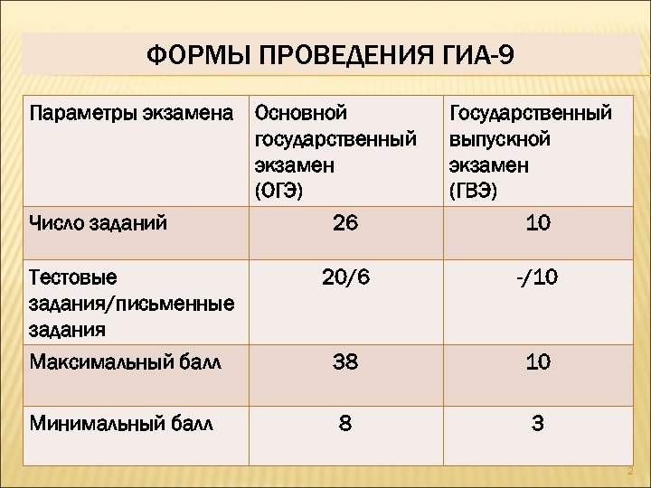ФОРМЫ ПРОВЕДЕНИЯ ГИА-9 Параметры экзамена Основной государственный экзамен (ОГЭ) Число заданий 26 Государственный выпускной экзамен (ГВЭ) 10 Тестовые задания/письменные задания 20/6 -/10 Максимальный балл 38 10 Минимальный балл 8 3 2