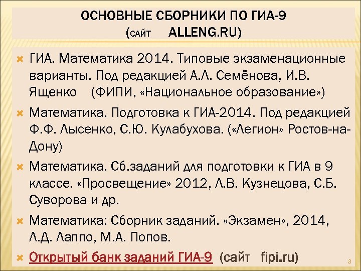 ОСНОВНЫЕ СБОРНИКИ ПО ГИА-9 (САЙТ ALLENG. RU) ГИА. Математика 2014. Типовые экзаменационные варианты. Под редакцией А. Л. Семёнова, И. В. Ященко (ФИПИ, «Национальное образование» ) Математика. Подготовка к ГИА-2014. Под редакцией Ф. Ф. Лысенко, С. Ю. Кулабухова. ( «Легион» Ростов-на. Дону) Математика. Сб. заданий для подготовки к ГИА в 9 классе. «Просвещение» 2012, Л. В. Кузнецова, С. Б. Суворова и др. Математика: Сборник заданий. «Экзамен» , 2014, Л. Д. Лаппо, М. А. Попов. Открытый банк заданий ГИА-9 (сайт fipi. ru) 3