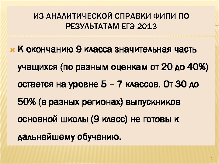 ИЗ АНАЛИТИЧЕСКОЙ СПРАВКИ ФИПИ ПО РЕЗУЛЬТАТАМ ЕГЭ 2013 К окончанию 9 класса значительная часть учащихся (по разным оценкам от 20 до 40%) остается на уровне 5 – 7 классов. От 30 до 50% (в разных регионах) выпускников основной школы (9 класс) не готовы к дальнейшему обучению. 5